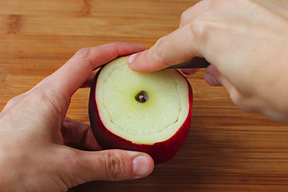 TIP: If an apple doesn’t sit exactly level, take a paring knife and slice off a few millimeters from the bottom to even off.